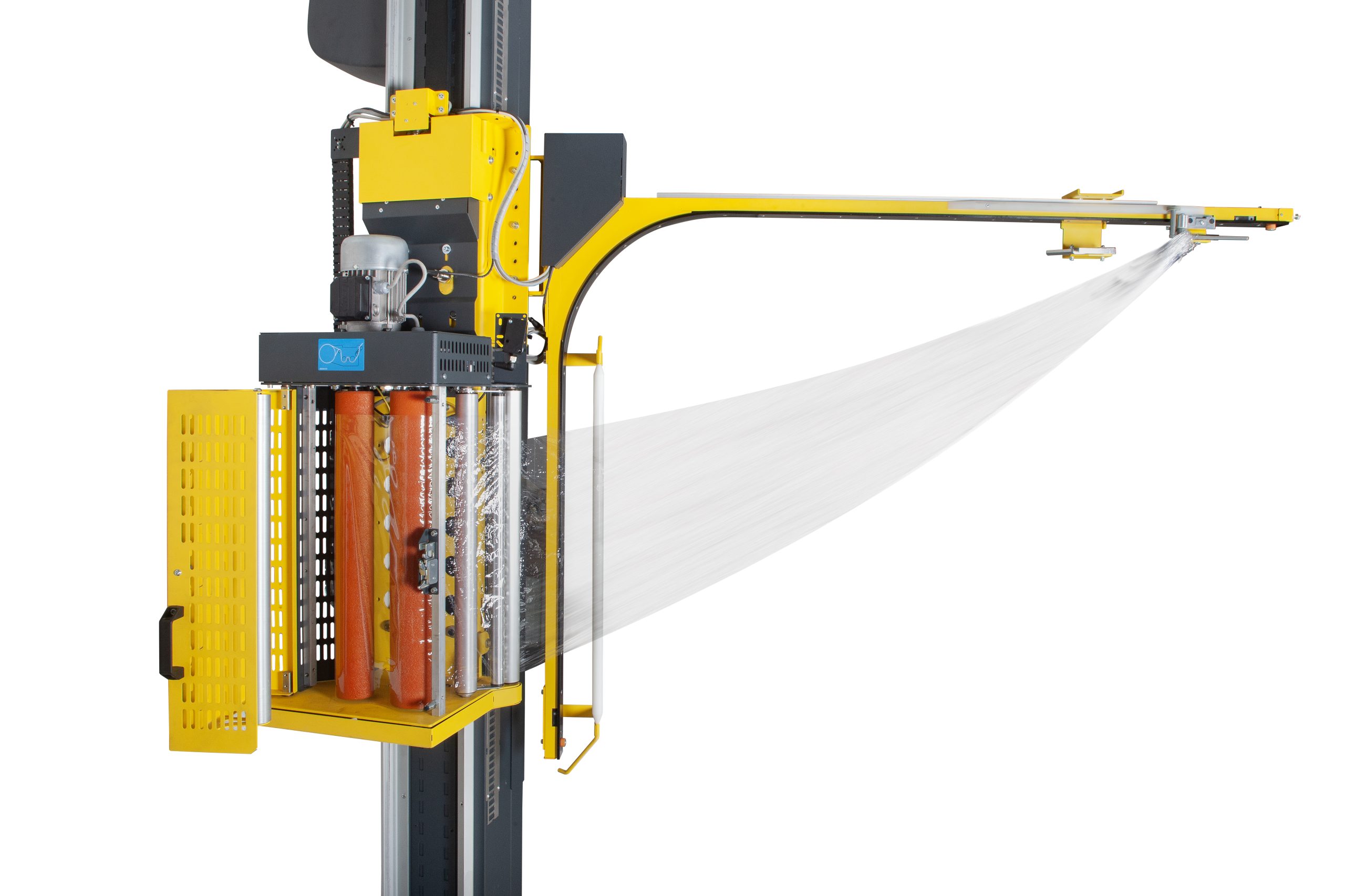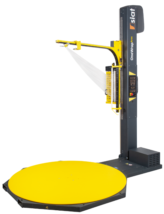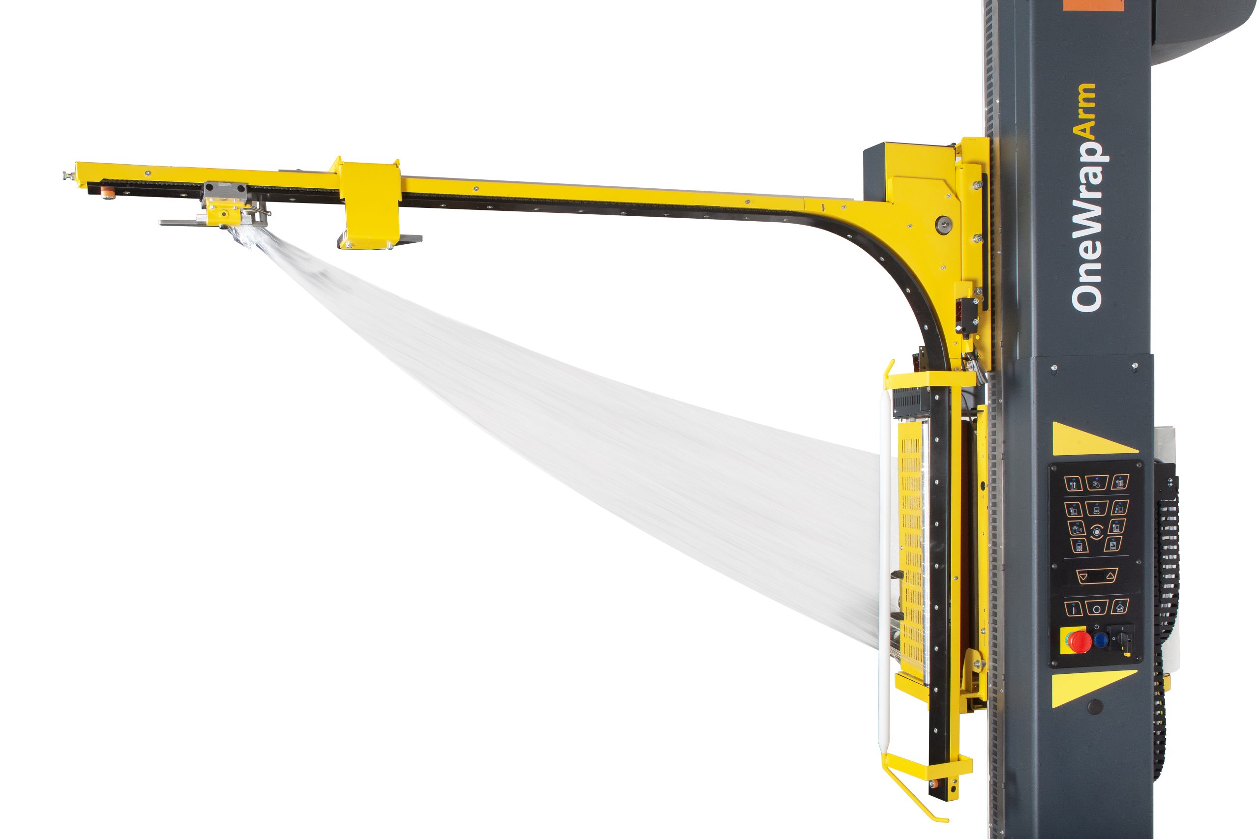 OneWrapArm är en halvautomatisk sträckfilmsmaskin som automatiskt fäster och skär av filmen i slutet av varje cykel, utan behov av skyddsstaket eller scanners.